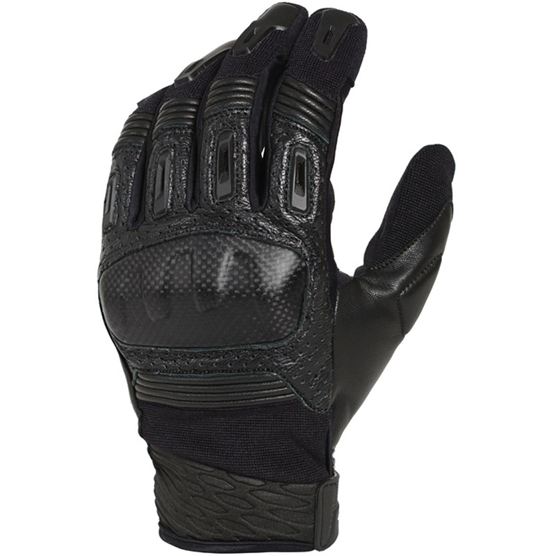 Guanti estivi con pelle e tessuto mesh, con protezioni. Colori: Nero. Comfort: Pannelli di ventilazione. Funzionalità: Cinghie regolabili. Materiali: Pelle. Tessuto. Sicurezza: Protezione dita. Protezione nocche. Protezione palmo. Rinforzi. Stile: Touring Adventure. Adatto per: Uomini. Tipo di clima: Caldo.