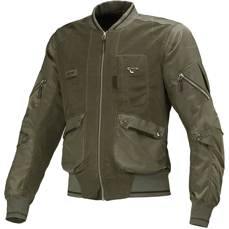 Giacca estiva in mesh traforata. Colori: Nero, verde. Comfort: Accessorio per cintura. Pannelli di ventilazione. Funzionalità: Cinghie regolabili. Materiali: Tessuto. Sicurezza: Predisposto per protezione schiena. Protezione gomito. Protezione spalle. Stile: Custom Retro. Adatto per: Uomini. Tecnologia: Belt Loop. Coathanger. Zip-grip. Tipo di clima: Caldo. Informazioni tecniche. Omologazione: CE. Protezione gomito CE livello 1. Protezione spalle CE livello 1. Materiali: Maglia